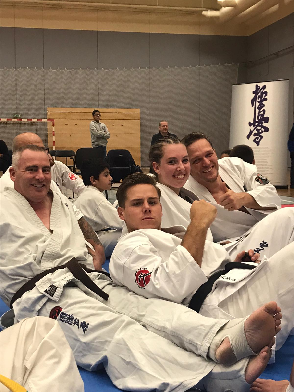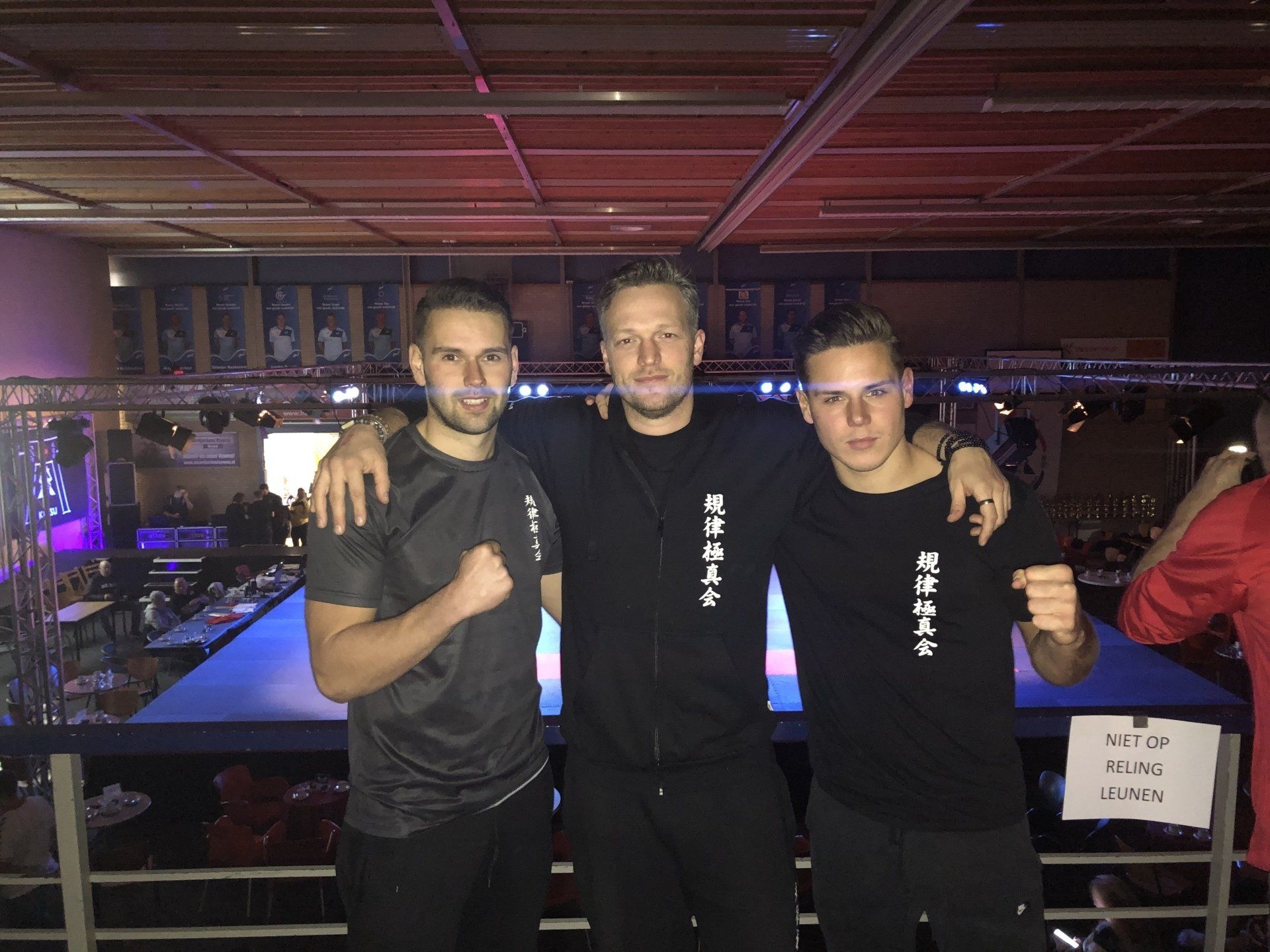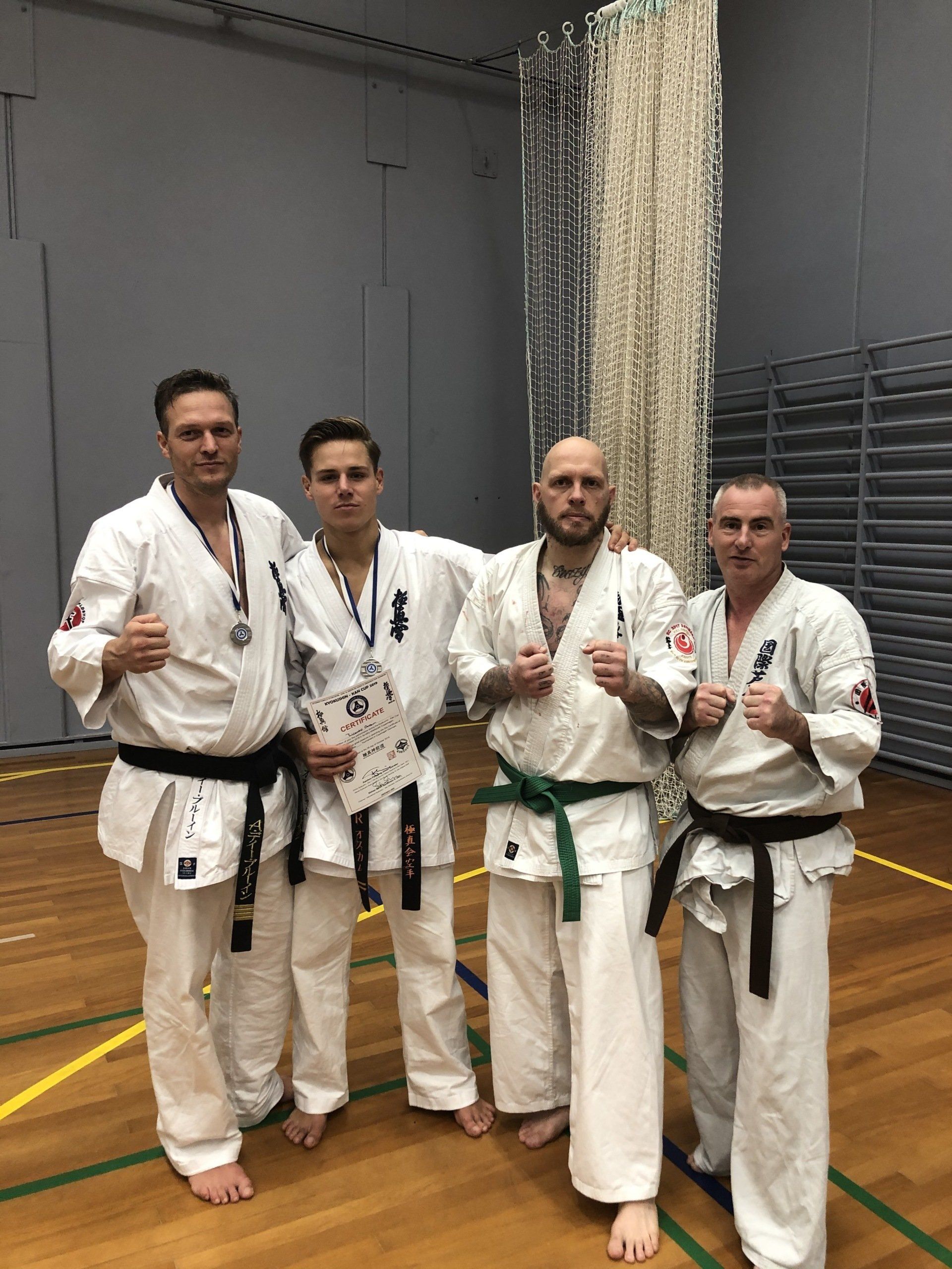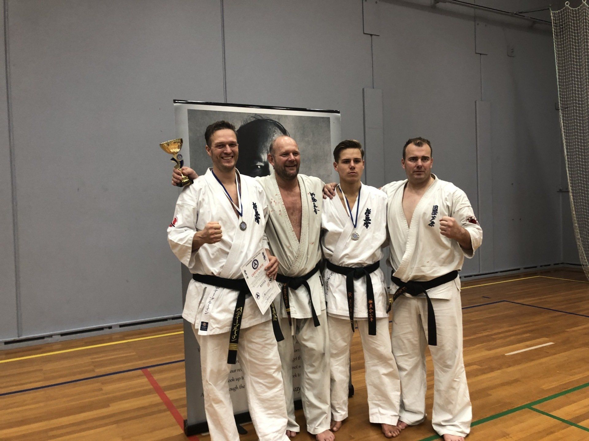 Sensei Arjen (3e), Sempai Ricardo (2e), Deense tegenstander en Maikel Ouwens van Kihon.