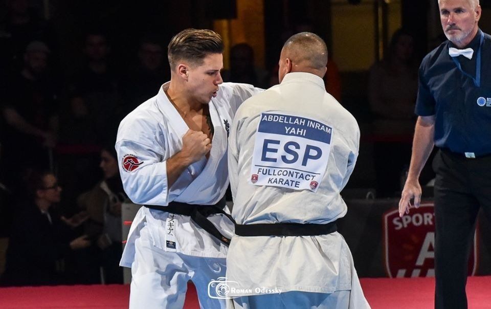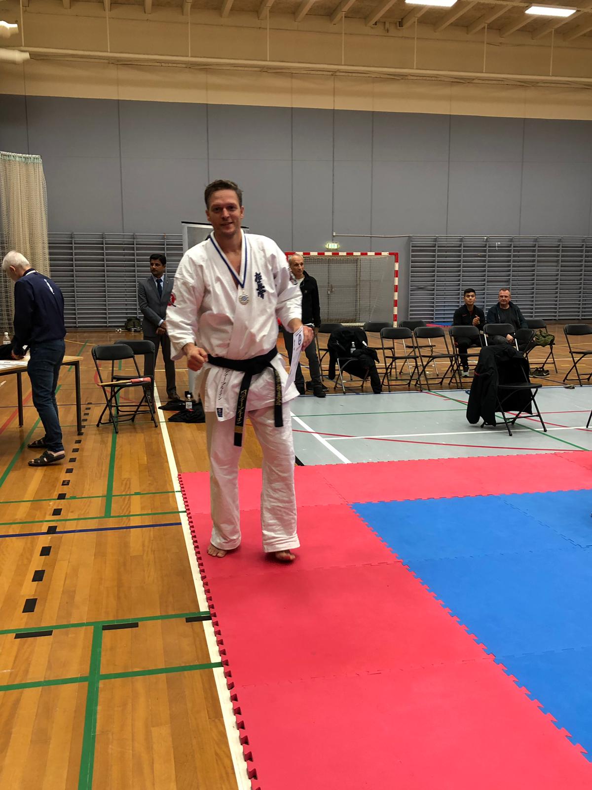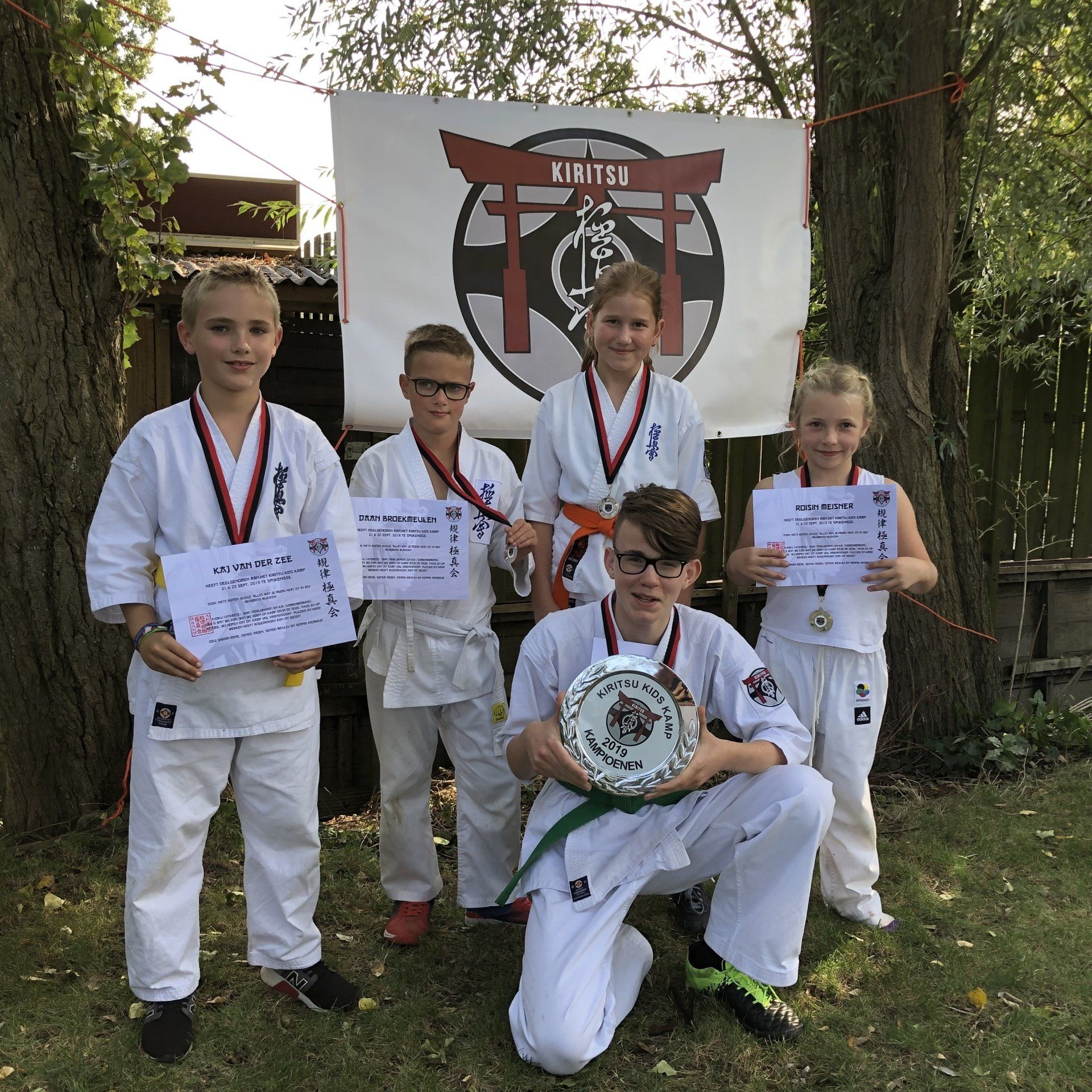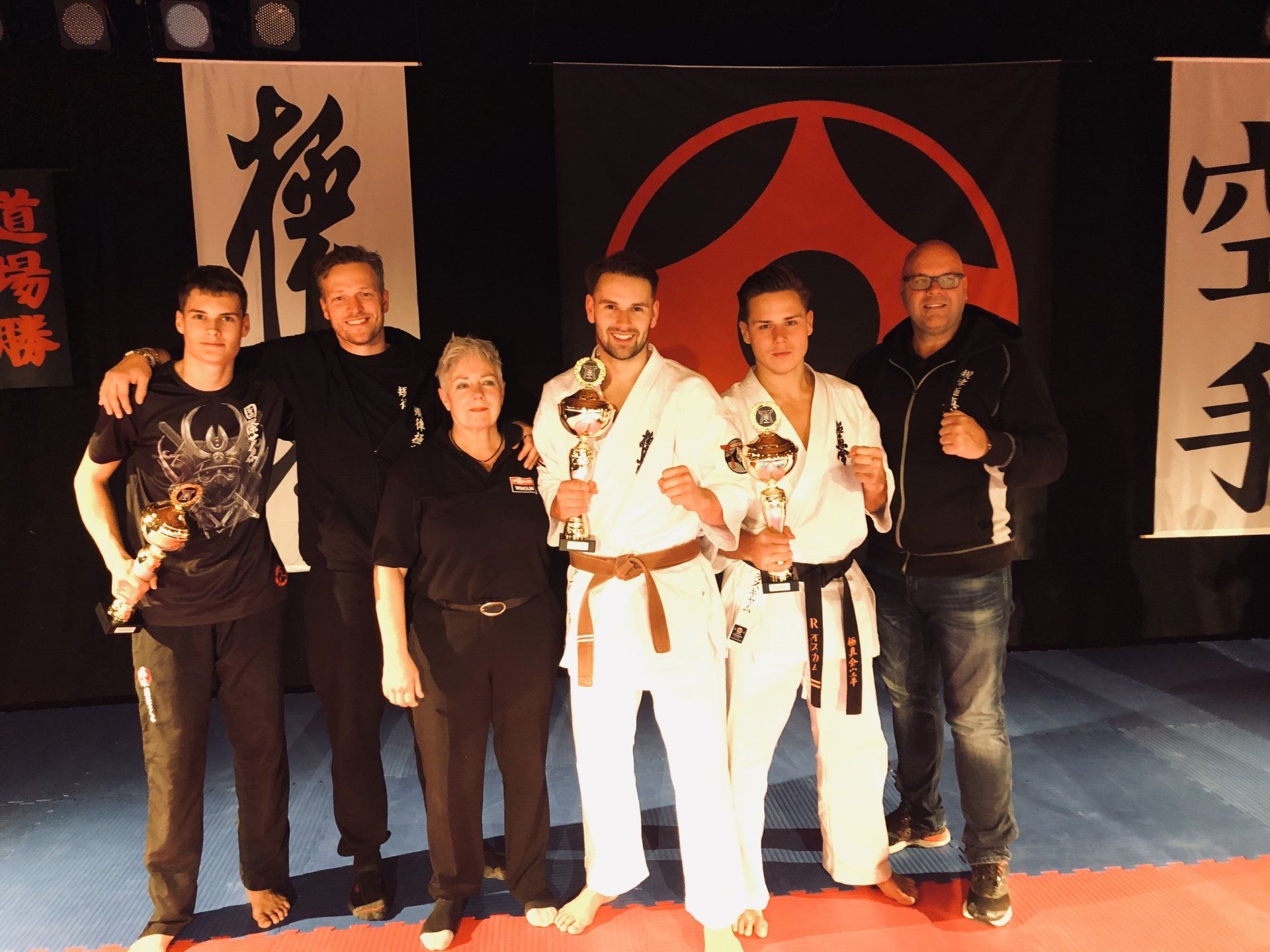 Sensei Arjen (3e), Sempai Ricardo (2e), Deense tegenstander en Maikel Ouwens van Kihon.